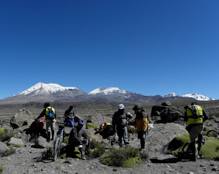 El terreno era plano, arenoso y prácticamente exento de vegetación, salvo una que otra yaretilla. Seguimos por una carretera arenosa hasta que llegamos a un lugar poblado de rocas que funcionó como un abrigo natural. Aquí descansamos y desayunamos. Como testigo de nuestra merienda estaba el lejano nevado, famoso por lo de la momia Juanita.
